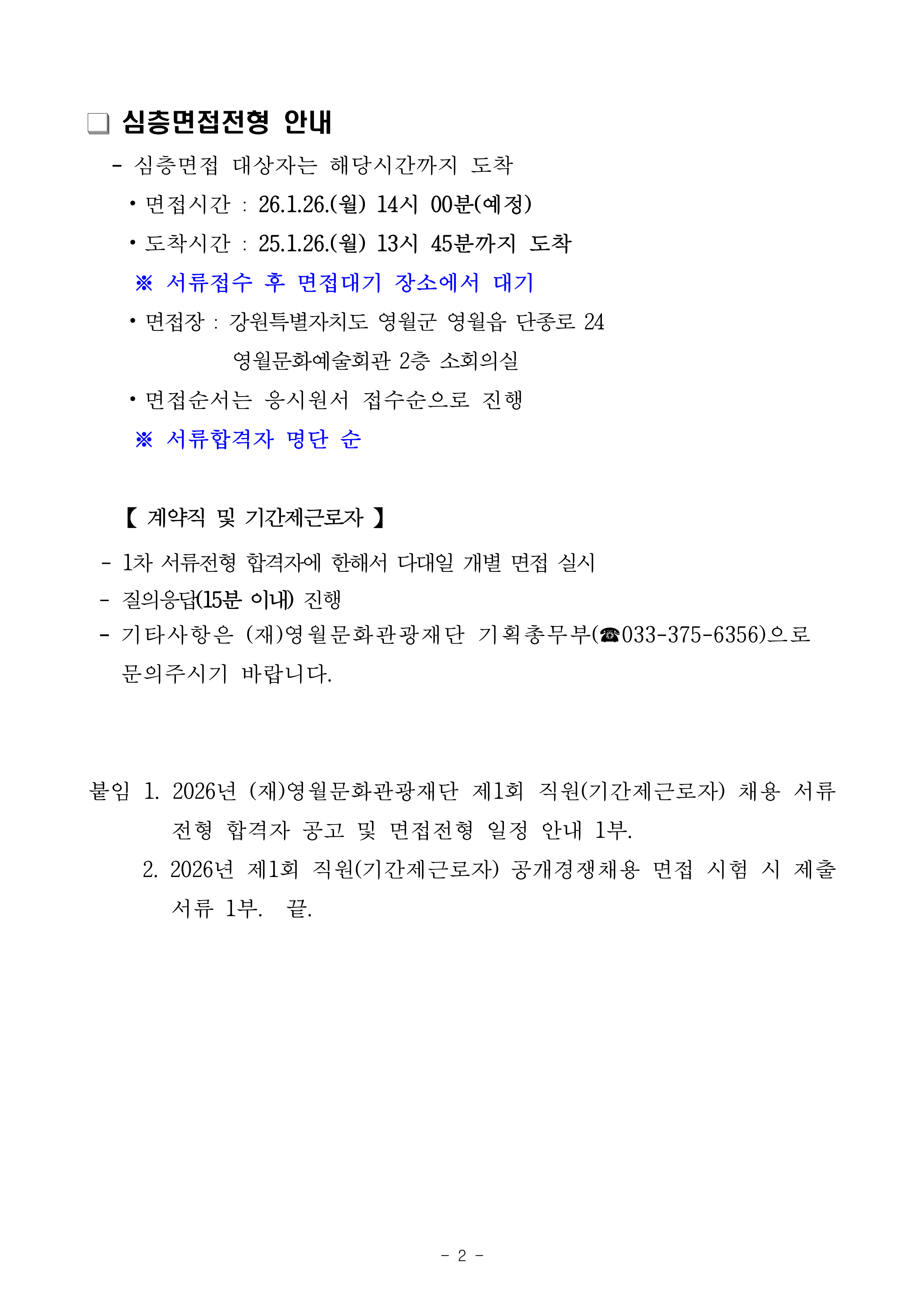 2026년 (재)영월문화관광재단 제1회 직원(기간제근로자) 공개경쟁 채용 서류전형합격자 공고 및 면접전형 일정 안내.pdf